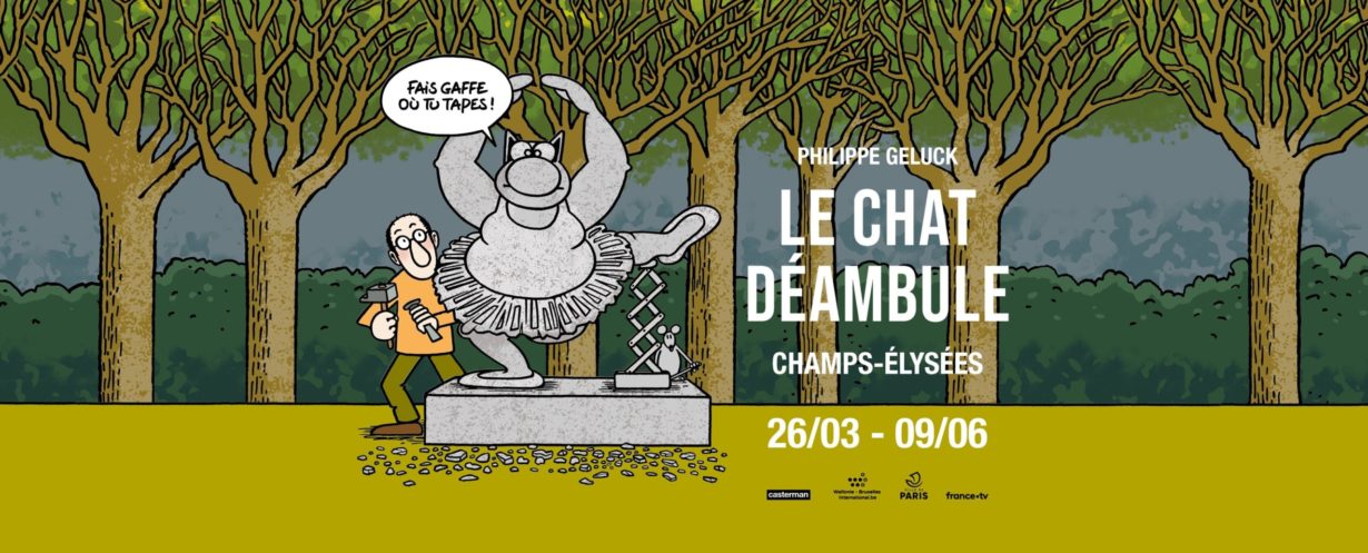 Depuis près de 40 ans, Le Chat est de toutes les aventures, dans tous les milieux et il donne son avis, inlassablement. Plus récemment, on le voit aux cotés du peintre Pierre Soulages, en ayant une place de choix dans son musée, ou revisitant la Bible. Il est parfois mondain, parfois consensuel, grinçant ou provocateur. Le Chat fait rire car il est grotesque, désinvolte et insolent, mais il tape juste, et ne dépasse pas les bornes. D’un trait simplissime, Geluck a multiplié les BD et les supports sur lesquels le félidé s’exprime. Geluck est lui-aussi devenu mondain et très présent dans les médias, mais comme son chat, il reste intègre, son discours n’est pas toujours lisse et il reste en accord avec lui-même. Il fait d’ailleurs l’unanimité auprès de ses confrères qui saluent son travail et son génie. Dernière action en date, les statues en bronze du Chat qui parsèment nos Champs-Elysées, et comme les consignes sanitaires permettent les activités en plein-air, celle-ci est idéale !