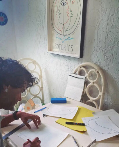 Pour mes fresques participatives, je n’ai gardé que la pratique du geste répétitif. Quand on commence un atelier, ça met tout le monde à l’aise et au même niveau, que vous soyez médecin, soignant, patient ou technicien d’entretien. Dans cette activité, qui peut être du dessin, du coloriage ou du collage, même si on se pose des questions, la main prend vite le relais, et chacun se surprend, et rencontre l’autre autrement. Ainsi quand ils investissent mes formes chacun applique son geste répétitif, de façon très simple ou très complexe. Je prends chacun là où il en est et je peux l’amener plus loin que ce qu’il pensait. Ils investiront concrètement la fresque qui habitera leur espace. »